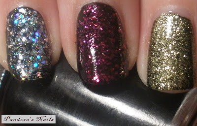 This is an excellent glitter polish, it is small gold glitter particles in a clear base and is super opaque, two coats was more than enough for even coverage with usual application. This polish was still ever so slightly gritty after top coat.